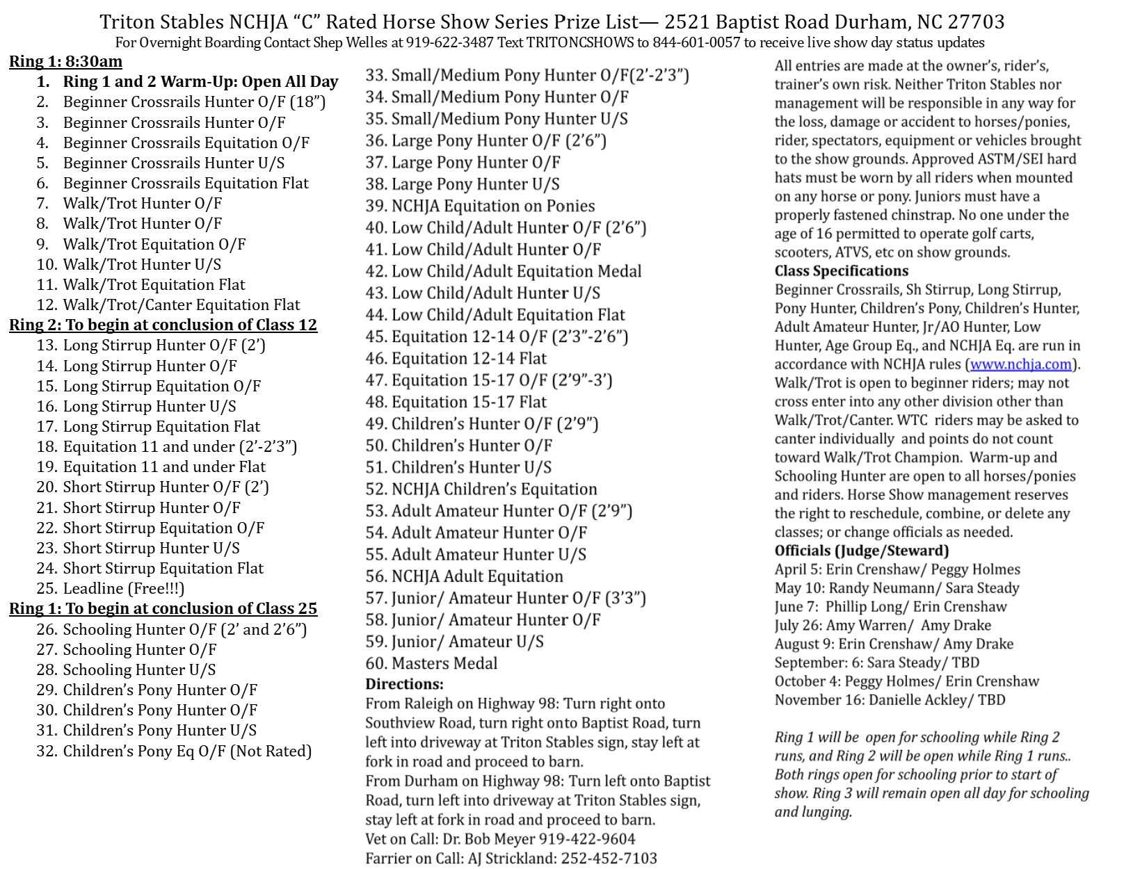 Triton Stables NCHJA āCā Rated Horse Show Series Prize List